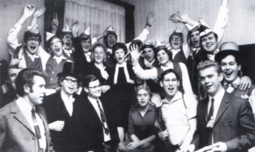 Gruppenleiter der ersten Ferienmaßnahme 1971 auf Ameland; stehend v.l.n.r. Werner Gauls, Winni Klar, Tono Thape, Nobby Poll, Ludger Klar, Wythold Snyder; sitzend: Lagerleiter Albert Ovel, Axel Obermeyer, Wolfgang Förster und Pofy Klar